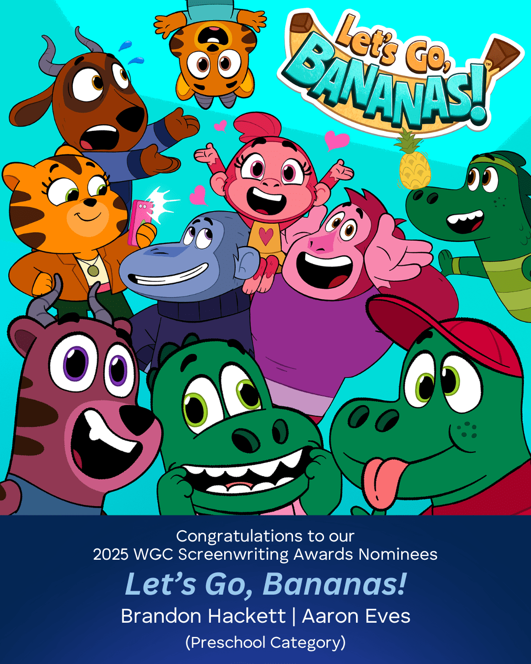 Letโs Go, Bananas!ย is created by Tim Bain (writer onย Bluey,ย PJ Masks, and creator of Nick Jrโsย Kangaroo Beach), based on his own joyfully bonkers family life. The show features a community of three sweet, silly animal families; gorilla girl Apple and her two Dads (the Bananas), crocodile twins Josh and Jamie and their single mother (the Crockers), and sisters Stellar and Piper and their tiger Mom and gazelle Dad (the Tiger-Zelles). Letโs Go, Bananas! is developed and produced by 9 Story Media Group, animated by Brown Bag Films (Toronto), and directed by Brown Bag Filmsโ own Matt Mitchell (Letโs Go Luna,โฏRosieโs Rules).